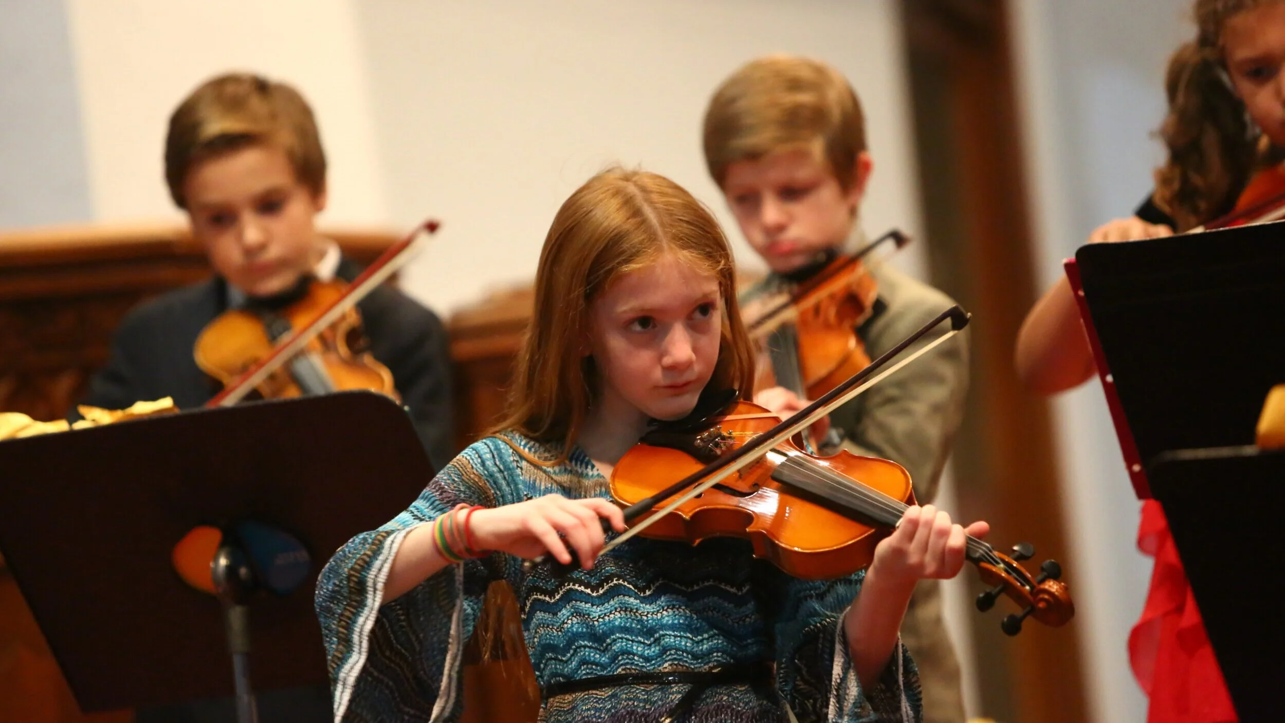 Waldorf educators have a deep appreciation for music and encourage students to appreciate music, too. Transitions in the early childhood class are marked with songs and notes played on a lyre. In the early elementary years, students learn to play the pentatonic flute and the recorder. In grade 3, students learn to play the violin and participate in a strings ensemble. In grade 5, they may continue with the violin or transition to the viola or cello. Middle school students participate in orchestra and choir. Singing, poetry, rhyming, and rhythm-building exercises abound in all grades.